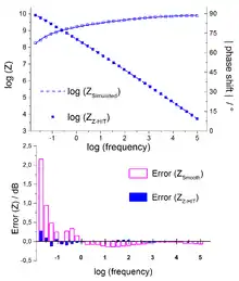 Figure 4 shows a Bode plot of an impedance series measurement, performed on a fuel cell where the hydrogen of the fuel gas was deliberately poisoned by the addition of carbon monoxide.[7] Due to the poisoning, active centers of the platinum catalyst are blocked, which severely impairs the performance of the fuel cell. Thereby, the blocking of the catalyst is depending on the potential, resulting in an alternating sorption and desorption of the carbon monoxide on the catalyst surface within the cell. This cyclical change of the active catalyst surface translates to pseudo-inductive behavior, which can be observed in the impedance spectrum of Figure 4 at low frequencies (< 3 Hz). The impedance curve was reconstructed by Z-HIT and is represented by the purple line, while the originally measured values are represented by the blue circles. The deviation in the low frequency part of the measurement can be clearly observed. Evaluation of the spectra shows [7] significantly better agreement between model and measurement if the reconstructed Z-HIT impedances are used instead of the original data.