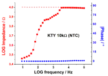 • Generally, the phase shift is more stable than the impedance. This is based on the fact that for impedance elements (more precisely: Constant phase element, CPE[4][5] ) the property "phase shift" remains constant even if the value of the impedance drastically changes. Such Constant Phase-elements are the typical electronic elements, among others such as the electrical resistor, capacitor and coil. For illustration, Figure 2 shows the impedance spectrum of an NTC resistor heated during the measurement (starting between 1 kHz and 10 kHz down to lower frequencies). It can clearly be seen that the value of the impedance (red curve) changes with temperature, while the phase shift (blue curve) remains constant. In other words, "a resistor remains a resistor".