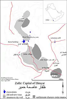 Ẓafār (Arabic: ظفار), also called Dhafar, is an ancient Himyarite site situated in Yemen, some 130 km south-south-east of today's capital, Sana'a, and c. 10 kilometres (6.2 mi) southeast of Yarim. Given mention in several ancient texts, there is little doubt about the pronunciation of the name.[1] Despite the opinion of local patriots in Oman, this site in Yemen is far older than its namesake there.[2] It lies in the Yemeni highlands at some 2800 m. Zafar was the capital of the Himyarites (110 BCE – 525 CE), which at its peak ruled most of the Arabian Peninsula.[3] For 250 years the tribal confederacy and allies' combined territory extended past Riyadh to the north and the Euphrates to the north-east.