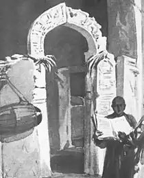 According to Muslim tradition, Muhammad and his companions briefly lived in Ethiopia in 622 after being exiled from Mecca in the First Hijra, although there is no archaeological evidence for this.[27] There is, however, evidence for a Muslim community[lower-alpha 1] in eastern Tigray during the Zagwe period, possibly being Shiites depending on Fatimid patronage.[28] Arabic funerary stelae discovered near Qwiha confirm the presence of an Islamic settlement between the 10th and 12th century, although its whereabouts are still unclear.[27] Recent excavations at nearby Bilet found a Muslim cemetery that was in use from the late 10th to the mid-13th century, although most tombstones date to the 11th century. The nisbas of the deceased suggest links with Egypt, the Arabian peninsula and even Iran. Another Islamic cemetery was found at Arra 30 km southwards and was used between the mid-12th and mid-14th century, with most tombstones dating to the 13th century.[30] A now broken frieze with a Kufic inscription stored in the Wukro Chirkos church probably dates to the second half of the 11th century and may have originally been from a mosque, perhaps sponsored by the Fatimids.[31] Tigray's Muslim community declined from the 12th century because of the collapse of the Fatimids and, if the land grant by king Tantawedem is to be believed, its dispossession by the Zagwe.[32]