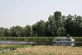 The Zasavica bog is a marshy lowland in the floodplain of the Sava River. It is a typical elongated oxbow (in Serbian: mrtvaja, dead [water]).[2] The fossilized, parallel bed of the Sava is so elongated that it actually stretches almost to the Drina river. In time, Zasavica river was formed from the subterranean waters from the Drina and from several streams, most notably, Duboka Jovača and Prekopac canal [3] (gravitationally, from the Cer mountain). The final section connecting Zasavica and Sava has been channeled (Bogaz canal). The river slowly meanders into and through the bog, widening from 50 metres (55 yd) to almost 300 metres (330 yd). The marsh, consisting of several connected bogs, covers an area of 11.5 square kilometres (4.4 sq mi). During normal water levels, the bog is 2.5 metres (8.2 ft) deep on average, but it can get up to 10 metres (33 ft) deep. The marshland's altitude varies from 76 to 82 meters (250 to 270 ft). The entire biotype includes also the Batar stream and several other canal-tributaries to Zasavica, and consists of an ecological row of water and marsh systems with fragments of flooded meadows and forests.[4] Through the Sava and Danube rivers, the Zasavica biotype belongs to the Black Sea drainage basin.