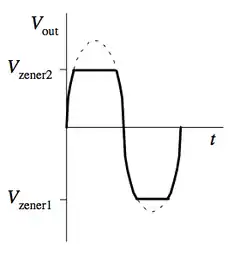 Two Zener diodes facing each other in series clip both halves of an input signal. Waveform clippers can be used not only to reshape a signal, but also to prevent voltage spikes from affecting circuits that are connected to the power supply.[11]