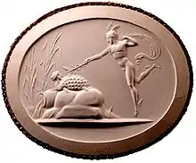 The first recorder of the fable was Cercidas some time in the 3rd century BCE.[4] During the Renaissance it was retold in a mixture of Greek and Latin poetic lines by Barthélémy Aneau in his emblem book Picta Poesis (1552)[5] and by Pantaleon Candidus in his Neo-Latin fable collection of 1604.[6] Later it appeared in idiomatic English in Roger L'Estrange's Fables of Aesop (1692).[7] Earlier, however, an alternative version of the story about the tortoise had been mentioned by the late 4th century CE author Servius in his commentary on Virgil's Aeneid. There it is a mountain nymph called Chelone (Χελώνη, the Greek for tortoise) who did not deign to be present at the wedding of Zeus. The divine messenger Hermes was then sent to throw her and her house into the river, where she was changed into the animal now bearing her name.[8]