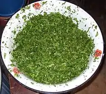 Zhingyalov hats (Armenian: Ժենգյալով հաց, also zhengyalav hatz, zhangyalov hats, or jingalov hats) is a type of flatbread stuffed with finely diced herbs and green vegetables.[1][2] It is a traditional dish of Armenians from Artsakh[3] and Syunik[4] and has traditionally been a staple in times of scarcity, such as famine and war.[5]
