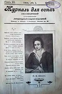 Viktor Mirolyubov who came to Zhurnal Dlya Vsekh in 1898 as its publisher and editor gathered around himself an impressive team of regular contributors, including Anton Chekhov, Maxim Gorky, Alexander Kuprin, Leonid Andreyev, Vikenty Veresayev, Yevgeny Chirikov, Konstantin Balmont and Alexander Khakhanov. By 1903 the magazine's circulation had raised to 80 thousand.[1] Zhurnal Dlya Vsekh was closed by the Russian authorities in autumn 1906, after it published several reports on the industrial unrest throughout Russia.