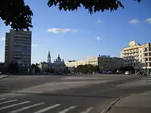 Victory Square with tank monument and Cathedral in Zhytomyr