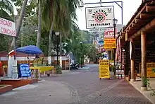 The heart of Zihuatanejo is the waterfront walkway Paseo del Pescador (Fisherman's Path), also called the malecón.[4] This tree-lined pedestrian walkway goes along the municipal beach between the archeological museum and the fishing pier.[17] It is lined with restaurants offering seafood and many other dishes, as well as a variety of stores selling rugs, arts and crafts and souvenirs, and a small shell market. In the evening, this area fills with people socializing.[17]