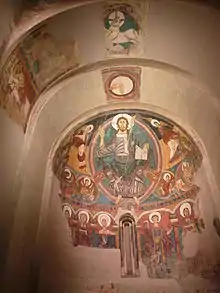 La pintura mural del ábside central de la iglesia de San Clemente de Tahull, forma parte del conjunto pictórico que comprende también la decoración de los arcos triunfales, la del ábside lateral, la inscripción de consagración y una ventana anterior. Hay más pintura "in situ".[18]