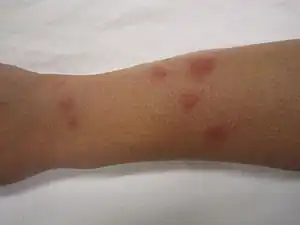 Los ácaros de cama o chinches de cama (Bed bugs en inglés) son un tipo de insecto que se alimenta de sangre humana, normalmente por la noche.[6] Sus picaduras pueden provocar una serie de impactos en la salud, que incluyen erupciones cutáneas, efectos psicológicos y síntomas alérgicos.[4] Las picaduras de los ácaros pueden provocar cambios en la piel que van desde áreas invisibles hasta pequeñas áreas de enrojecimiento y ampollas prominentes.[1][2] Los síntomas pueden tardar entre minutos y días en aparecer y por lo general también se presenta picazón.[2] Algunas personas pueden sentirse cansadas o tener fiebre.[2] Es común que las áreas descubiertas del cuerpo sean las afectadas y, a menudo, se producen tres mordeduras seguidas.[2] Se desconoce si las picaduras de ácaros transmiten ninguna enfermedad infecciosa.[4][6] En raras ocasiones, las complicaciones pueden incluir áreas de piel muerta o vasculitis.[2]