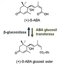 El ABA o sus metabolitos pueden ser inactivados mediante conjugación con otra molécula. El conjugado más común es el glucosil éster de ABA (ABA-GE), que se forma a través de una reacción de esterificación llevada a cabo por una glucosiltranferasa. Al contrario que la ruta oxidativa, la inactivación de ABA por conjugación con glucosa es un proceso reversible. La hidrólisis de ABA-GE la lleva a cabo una β-glucosidasa y resulta en la liberación de ABA. Además, la forma ABA-GE es no solo una forma de almacenamiento de ABA sino también de transporte. El ABA-GE se acumula en las vacuolas y en el apoplasto, pero se transporte al retículo endoplásmico en respuesta a deshidratación.