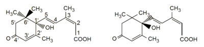 | (2Z,4E)-5-[(1S)-1-hydroxy-2,6,6-trimethyl-4-oxocyclohex-2-en-1-yl]-3-methylpenta-2,4-dienoic acid[6] | ||