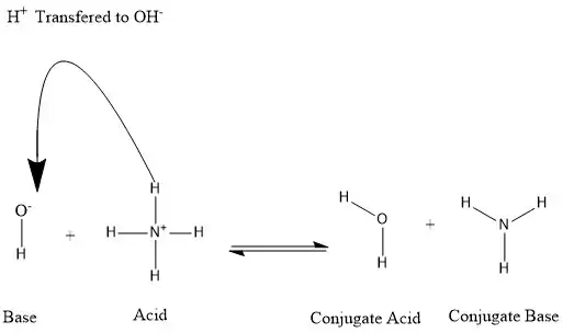 Decimos que la molécula de agua es el ácido conjugado del ion hidróxido después de que este último recibió el protón de hidrógeno donado por amonio. Por otro lado, el amoníaco es la base conjugada para el ácido amonio después de que el amonio ha donado un ion hidrógeno a la producción de la molécula de agua. También podemos referirnos a OH- como una base conjugada de H