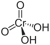 El ácido crómico también designa al compuesto químico de fórmula H2CrO4 cuyo anhídrido es el citado trióxido de cromo, CrO3, que se suele citar también con el nombre de ácido crómico.[2] El cromo aparece en un estado de oxidación +6 (o VI) en el ácido crómico. Es un fuerte agente oxidante y corrosivo.