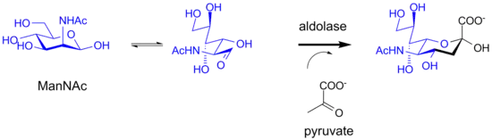 En sistemas bacteriales, los ácidos siálicos son biosintetizados por una enzima tipo aldolasa. La enzima utiliza un derivado de la manosa (N-Acetil-2-manosamina) como sustrato, en donde se efectúa una condensación aldólica con una molécula de ácido pirúvico, la cual aporta con tres carbonos del ácido siálico.[2]