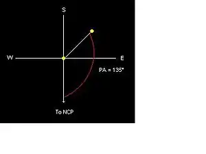 Como ilustra el ejemplo, si se observa una estrella binaria hipotética con un AP de 135 grados, lo que significa una línea imaginaria en el ocular elaborado desde el polo norte celeste (PNC) en el primario (P) se vería compensado desde el secundario (S) de tal manera que el ángulo de PNC-P-S sería de 135 grados.