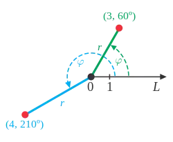 Una rotación en el sentido de las agujas del reloj se considera una rotación negativa, por lo que, por ejemplo, una rotación de 310° (en sentido contrario a las agujas del reloj) también se puede llamar una rotación de –50° (dado que 310° + 50° = 360° es una rotación completa (vuelta)). Una rotación en sentido contrario a las agujas del reloj de más de una vuelta completa se mide normalmente en módulo 360°, lo que significa que se resta 360° tantas veces como sea posible para dejar una medición no negativa de menos de 360°.[5]