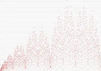 r), 0 ≤ 2r < n,[10] y también cuenta el número de formas de escribir n como una suma de powers of two en la que cada potencia aparece como máximo dos veces. Esto se puede ver en el fusc que define la recurrencia: las expresiones como una suma de potencias de dos para un número par 2n no tienen 1 (en cuyo caso se forman duplicando cada término en una expresión para n) o dos 1 (en cuyo caso el resto de la expresión se forma duplicando cada término en una expresión para n − 1), por lo que el número de representaciones es la suma del número de representaciones para n y para n − 1, coincidiendo con la recurrencia. De manera similar, cada representación de un número impar 2n + 1 se forma duplicando una representación de n y sumando 1, igualando nuevamente la recurrencia.[11] Por ejemplo,