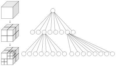 En una estructura octree, cada nodo subdivide el espacio que representa en ocho octantes. En una región punto (PR) octree, el nodo almacena un punto tridimensional explícito, el cual es el "centro" de la subdivisión para ese nodo; el punto que define una de las esquinas para cada uno de los ocho hijos. En una octree MX, el punto de subdivisión es implícitamente el centro del espacio que el nodo representa. El nodo raíz de una PR octree puede representar un espacio infinito; el nodo raíz de una octree MX debe representar un espacio con límite finito para que los centros implícitos estén bien definidos. Las estructuras octree nunca se consideran árbol kd, ya que los árboles kd dividen en una dimensión mientras que las estructuras octree dividen alrededor de un punto. Los árboles kd además son siempre binarios, lo cual no se cumple para las estructuras octree.