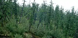 El permafrost, que es suelo (o roca) que permanece a temperaturas por debajo de 0 °C durante por lo menos dos años consecutivos[14] forma una matriz sólida en el suelo que puede extenderse hasta profundidades de cientos de metros.[15] El permafrost evita que los árboles puedan desarrollar sistemas de raíces profundos; por ejemplo el abeto negro que se ha adaptado a los suelos permafrost no posee una raíz primaria importante.[16] En zonas en las cuales la temperatura del permafrost se encuentra próxima al punto de fusión del agua, variaciones del clima, o pérdida de la vegetación de la superficie a causa del fuego, inundaciones, construcciones o deforestación, pueden ablandar las porciones superiores del permafrost, creando un termokarst,[17] que es el nombre científico para un colapso del suelo causado por permafrost que se derrite.[13]