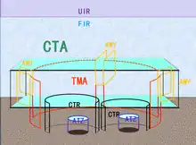 El espacio aéreo TMA normalmente está diseñado generalmente en una configuración circular centrada en uno o varios aeropuertos y se diferencia de una zona de control (CTR) en que abarca áreas mayores, creando una forma de "pastel de bodas al revés".