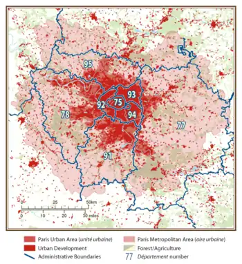 A partir de 2022, el área metropolitana de París estadística del INSEE cubre 1929 municipios.[14] Con sus 18 941 km², se extiende significativamente más allá de la región administrativa de Isla de Francia de París (12 012 km²).[15] Fuera de la región de Isla de Francia, cubre parte de los departamentos de Aisne, Aube, Eure, Eure-et-Loir, Loiret, Marne, Oise, Sena Marítimo y Yonne.[14]