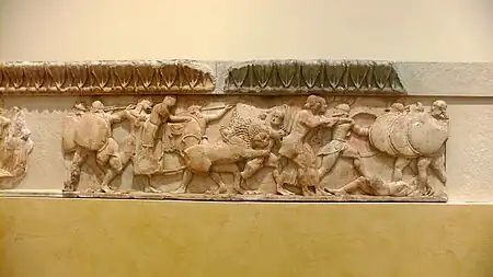 ![]() Frontón oriental, con la figura de Zeus en el centro (donde el espacio permite la representación de una figura de mayor tamaño) y la disputa entre Apolo y Heracles por la posesión del trípode de Delfos. Debajo, en la parte correspondiente del friso, se representa la guerra de Troya. A la izquierda, una asamblea de los dioses olímpicos (sentados de perfil, como en la plástica egipcia,[50] pero con mucha más movilidad y realismo) deciden el destino de los hombres: los filo-troyanos son Ares, Afrodita, Artemisa y Apolo; los filo-aqueos son Atenea, Hera y otra diosa (quizá Deméter). Los bandos se determinaron por la decisión del troyano Paris en el juicio por la posesión de la manzana de Discordia, que se representa bajo el frontón occidental. La posición decisiva de Zeus tendrá que responder, más que a sus simpatías personales, a su condición arbitral y al mantenimiento de la paz doméstica (su esposa e hija están inclinadas hacia Grecia, mientras que una de sus múltiples amadas, la ninfa Tetis, con la que tiene una importante deuda de gratitud, le ruega a sus pies por su hijo Aquiles -que en ese momento está resentido con Agamenón-). Es una perfecta metáfora de la política en las polis arcaicas. ![]() Friso norte, con la Gigantomaquia, uno de los temas principales del arte griego, que da forma a un aspecto esencial de la forma griega de entender el mundo: la victoria del orden (κόσμος, kosmos-) sobre el desorden (χάος, khaos), de la cultura (τέχνη, techne) sobre la naturaleza (φύσις, physis) o de la civilización sobre la barbarie.[1] Las fuerzas del orden, a la izquierda (los dioses olímpicos, ayudados por Heracles), vencen a las del caos, a la derecha (representados aquí como hoplitas: los gigantes, hijos de Gea -la tierra- y de la sangre de Uranos -el cielo, muerto por su hijo Cronos, el tiempo, padre de Zeus y los demás olímpicos-). Hay un evidente paralelismo formal entre la escena del ataque del león y motivos similares en los relieves de la Apadana de Persépolis (hacia 515 a. C.),[51] que tienen una lectura religiosa en el zoroastrismo (Noruz o "año nuevo"), además de tener como precedentes lejanos los relieves animalísticos asirios.[52] El Tesoro de los Sifnios del santuario de Delfos es uno de los mejor datados de este periodo: año 525 a. C.[53] |