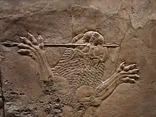 Crátera de Eufronio (cerámica de figuras rojas de Eufronio, hacia 515 a. C.). La escena representa al cuerpo de Sarpedón sostenido por Eros y Tánatos, ante Hermes.[77]