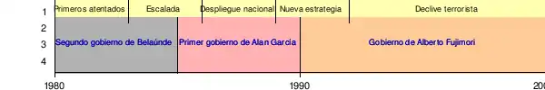 La época del terrorismo en el Perú o el conflicto armado interno peruano[lower-alpha 2] es un conflicto armado[lower-alpha 3] ocurrido en ese país entre los años 1980 y 2000 durante el cual las organizaciones Partido Comunista del Perú-Sendero Luminoso (PCP-SL)[lower-alpha 4] y Movimiento Revolucionario Túpac Amaru (MRTA) desplegaron diversas acciones terroristas con el objetivo de derrocar al Estado existente y reemplazarlo por un Estado socialista, y fueron repelidas en distintas operaciones antisubversivas. El periodo incluye múltiples atentados terroristas, golpes de Estado,[lower-alpha 5] acciones armadas y crímenes contra los derechos humanos, y es el más sangriento de la historia del Perú.[36] Son también usuales varios otros términos para denominarlo, como «periodo de violencia 1980-2000» (ver sección al respecto).