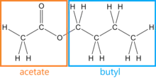En el dibujo, en el lado izquierdo se observa la parte que procede del ácido (en rojo; etanoato) y la parte de la derecha procede del alcohol (en azul, de etilo).