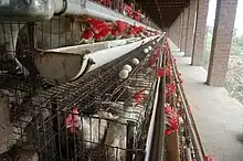 Las jaulas en batería son la forma predominante de alojamiento para las gallinas ponedoras en todo el mundo. Estas jaulas reducen la agresión y el canibalismo entre las gallinas, pero las vuelven estériles, restringen su movimiento y aumentan las tasas de osteoporosis.[64][65][66] En estos sistemas, así como en la producción de huevos de corral, los polluelos machos son sacrificados al nacer con el fin de asegurar una nueva generación de gallinas ponedoras de huevos.[67] Se estima que un consumidor medio come doscientos huevos por año a lo largo de setenta años de su vida, con lo que es responsable de la muerte de ciento cuarenta aves. De la misma manera un consumidor medio de leche que bebe 190 kg por año durante setenta años es responsable de la muerte de dos vacas y media.[68]