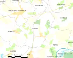 Étriché es una población y comuna francesa, en la región de Países del Loira, departamento de Maine y Loira, en el distrito de Angers y cantón de Durtal.