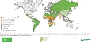 El GHI de 2014 fue calculado para 120 países en vías de desarrollo y economías en transición, 56 de los cuales con una situación de hambre grave o peor.[11]