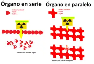 - Órgano en paralelo: Son los órganos que tienen una “baja serialidad relativa”, que el parámetro más importante es el tamaño relativo con respecto al volumen total del volumen irradiado por encima del nivel de tolerancia. Se necesita la destrucción por radiación de muchas o todas las subunidades para provocar una insuficiencia orgánica, por ejemplo los pulmones o el hígado.
