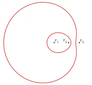(Las ecuaciones están dadas según la distancia de un punto M cualquiera de la curva respecto a los tres focos F1, F2 y F3)