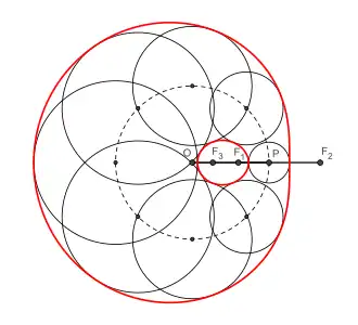 Cada círculo (ΓM) es tangencial al óvalo en dos puntos TM T'M, siempre alineados con el tercer foco F3 del óvalo.[14]