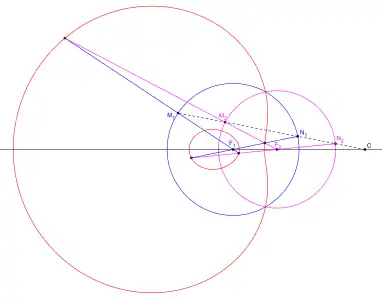 ![]() Óvalo de ecuación 4F1M ± 3F2M = ± 2F1F2 construido a partir del punto C, baricentro de los puntos F1 y F2 afectados de los coeficientes -3 y 4, y con las circunferencias de centros F1 y F2 y de radios respectivos 3⁄2F1F2 y 4⁄3F1F2. |