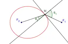 Así, si se denomina θ1 al ángulo que forma F1M con la normal y θ2 al ángulo que forma F2M con la normal, se tiene la igualdad: