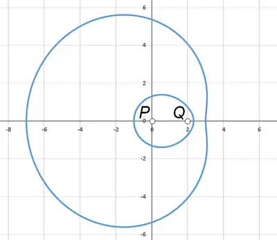 que tienen soluciones reales. Los dos óvalos generalmente son disjuntos, excepto en el caso de que P o Q les pertenezcan. Al menos una de las dos perpendiculares a PQ a través de los puntos P y Q corta esta curva cuártica en cuatro puntos reales; de esto se deduce que están necesariamente anidados, con al menos uno de los dos puntos P y Q contenidos en los interiores de ambos óvalos.[2] Para una parametrización diferente y el análisis del resultado cuártico, consúltese Lawrence.[3]