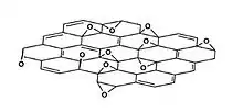 El óxido de grafito, formalmente llamado óxido grafítico o ácido grafítico, es un compuesto de carbono, oxígeno e hidrógeno en proporciones variables, obtenido tras el tratamiento de grafito con un oxidante fuerte. El producto con mayor grado de oxidación es un sólido amarillo con una proporción C:O de entre 2.1 y 2.9 que mantiene la estructura en capas del grafito pero con un espacio entre capas mucho más grande e irregular.[2] El óxido de grafito en medio básico se dispersa en forma de hojitas monomoleculares conocidas como óxido de grafeno, por analogía con el grafeno, que es una única capa de grafito.[3] El óxido de grafeno en forma de láminas se ha empleado para fabricar un material muy resistente y que recientemente ha atraído la atención como una posible fuente de obtención de grafeno. Sin embargo, este método, cuyos primeros resultados se alcanzaron en 2012, proporciona grafeno con una estructura muy defectuosa.
