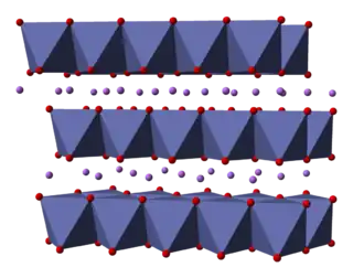 El sólido está formado por capas de cationes de litio monovalentes (Li+) que se encuentran entre láminas aniónicas extendidas de átomos de cobalto y oxígeno, dispuestas como octaedros de bordes compartidos, con dos caras paralelas al plano de la lámina.[6] Los átomos de cobalto se encuentran formalmente en el estado de oxidación trivalente (Co3+) y están intercalados entre dos capas de átomos de oxígeno (O2-).
