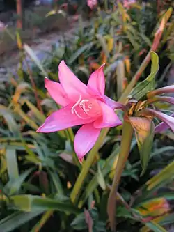 × Amarcrinum memoria-corsii (Ragion.) H.E.Moore, Baileya 19: 163 (1975). Producto de la hibridación entre Amaryllis belladonna × Crinum moorei.