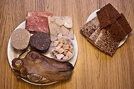 ![]() Izquierda (de la parte superior a la inferior, izq a der): Hangikjöt, Hrútspungar, Lifrarpylsa, Blóðmör, Hákarl, Svið. Derecha: Rúgbrauð (de color marrón oscuro), Flatbrauð | ||