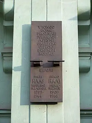 ![]() Placa en recuerdo de Pavel Haas y Hugo Haas en la calle del Obispado de Brno. | ||