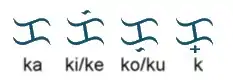 Si un punto se añade a la parte superior (ᜃᜒ), el sonido se convierte en un sonido qué o qui, por su parte, si un punto se añade a la parte inferior (ᜃᜓ), el sonido se convierte en un sonido co o cú. El sonido se convierte en una consonante c si un virama se agrega a la parte inferior (ᜃ᜔).