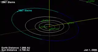 ![]() Órbita de Šteins y su posición el 1 de julio de 2000 respecto a los planetas interiores.