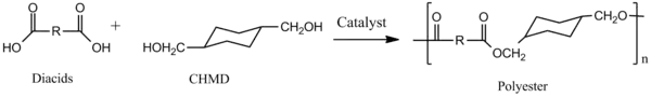 Los poliésteres termoplásticos que contienen 1,4-ciclohexanodimetanol presentan mayor consistencia, transparencia y resistencia a los disolventes. Las características exactas de los poliésteres varían desde el poli(tereftalato de 1,4-ciclohexilendimetileno) o PCT, cristalino y con elevado punto de fusión, hasta los copoliésteres no cristalinos que combinan etilenglicol y 1,4-ciclohexanodimetanol en su estructura. Las propiedades de estos poliésteres también dependen de la proporción cis/trans que posea el 1,4-ciclohexanodimetanol.[11] Este diol tiene un bajo punto de fusión y reduce el grado de cristalinidad del homopolímero de PET, mejorando su procesabilidad. Este factor hace que el polímero tienda a degradarse menos a acetaldehído y a otros productos de degradación no deseados.