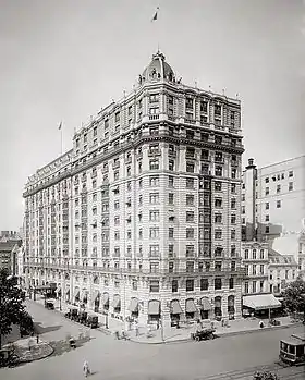 El Shepherd Centennial Building fue convertido en hotel en 1893 por el arquitecto Leon E. Dessez y rebautizado como Raleigh Hotel.[2] El hotel Raleigh fue demolido en 1911 y reconstruido por el arquitecto Henry Janeway Hardenbergh como un hotel Beaux Arts de 13 pisos con un exterior de ladrillo rústico, piedra caliza blanca y terracota. El Congreso cambió el límite de altura para los edificios en Pennsylvania Avenue NW de 130 pies (39,6 m) a 160 pies (48,8 m) en 1910 para albergar el Hotel Raleigh.