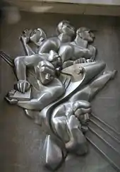 El panel de acero inoxidable 9 LT Isamu Noguchi, News, está ubicado sobre la entrada. Su trabajo, que describe las diversas formas de comunicación utilizadas por los periodistas en la década de 1930, rinde homenaje a las diferentes ocupaciones en la industria de las noticias.[19][20] Es una de las últimas obras abstractas de Noguchi, así como la única obra de acero inoxidable que encargó.[20]