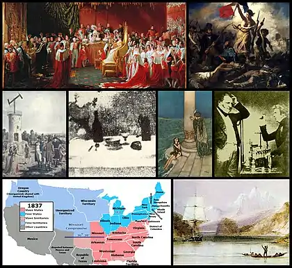 Desde arriba a la izquierda, en el sentido de las agujas del reloj: la Coronación de Victoria del Reino Unido marcó el comienzo de su reinado de 64 años. Su reinado significó el renacimiento del Imperio Británico, ya que el Reino Unido rápidamente creció poderosamente territorial y económicamente. Bajo su gobierno, Gran Bretaña vio una agitación masiva del poder colonial, ya que más de una cuarta parte del mundo cayó en el dominio británico; La revolución de 1830 restableció los valores liberales, y más tarde el imperialismo francés, nuevamente en la gobernanza y el poder franceses. La revolución resultó en el destronamiento del rey Carlos X de Francia e indirectamente renació el imperio colonial francés; los estudios de Michael Faraday y John Frederic Daniell ayudaron a formar la base de la electroquímica a través del descubrimiento de la inducción electromagnética. Sus descubrimientos moldearon una gran parte de la química contemporánea y cambiaron para siempre la forma en que las personas utilizaban la electricidad; HMS Beagle circunnavega el mundo dos veces. Su segunda expedición con Charles Darwin ha demostrado ser particularmente pionera, ya que los descubrimientos y las teorías que hizo en dicho viaje, lo ayudaron a desarrollar la teoría de la evolución, el consenso científico ampliamente mejorado y el conocimiento sobre taxonomía y biología, y dieron a luz el concepto de selección natural; Los Estados libres y estados esclavistas crecen en número y poder, un movimiento dinámico ampliamente percibido como un preludio de la Guerra Civil estadounidense a medida que la abolición y el establecimiento comenzaron a polarizar sociopolíticamente la sociedad estadounidense, formando posteriormente estados de la Unión y Confederados; El telégrafo es inventado por Samuel Morse. Su patente abrió el mundo a las redes globales y rompió largas distancias como límites con ellas, la primera de su tipo; Una imagen de naturaleza muerta de 1832 desarrollada por un daguerrotipo. El daguerrotipo se introdujo por primera vez al público en 1839. Su lanzamiento lo convirtió en el primer invento que permitió al público capturar imágenes en movimiento de forma recurrente, un movimiento que eventualmente fomentaría el crecimiento de la fotografía moderna; Hans Christian Andersen publica su primera colección de cuentos de hadas en 1837. Sus publicaciones transformaron profundamente la literatura y se convirtieron en uno de los escritores de cuentos más populares e influyentes del siglo XIX, con historias como La Sirenita (como se muestra en la imagen) y Pulgarcita, un legado que hoy conserva como el icono nacional de Dinamarca.