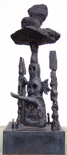 A pesar del poco detalle estético, la calidad áspera y simpleza de su construcción, tienen las mismas formas antropomorfas simbólicas, como el de sus pinturas simbólicas planas. Sus pinturas posiblemente estén influenciadas por los trabajos de Paul Klee y mezclan la llanura de la escritura egipcia o maya con la crudeza de las últimas pinturas negras, como las de Jackson Pollock. Las esculturas son a menudo evocadoras de las cabezas de piedra de la isla de Pascua y de otras manifestaciones del arte polinésico.